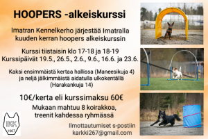 Hoopersin alkeiskurssi touko-kesäkuussa Imatran Kennelkerhon jäsenille. Lajista ei vaadita aiempaa kokemusta. Kouluttajina Mervi Laakso ja Karoliina Laakkonen. Maksutiedot lähetetään kurssille mukaan mahtuneille.